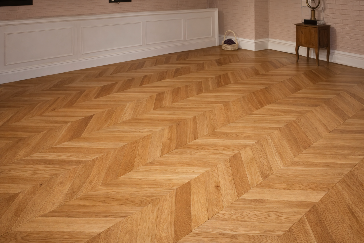 Також важливо враховувати розміри планок і породу деревини. Від цих факторів залежить виразність візерунка та загальний вигляд підлоги, адже такий тип укладання підкреслює структуру натуральної деревини.