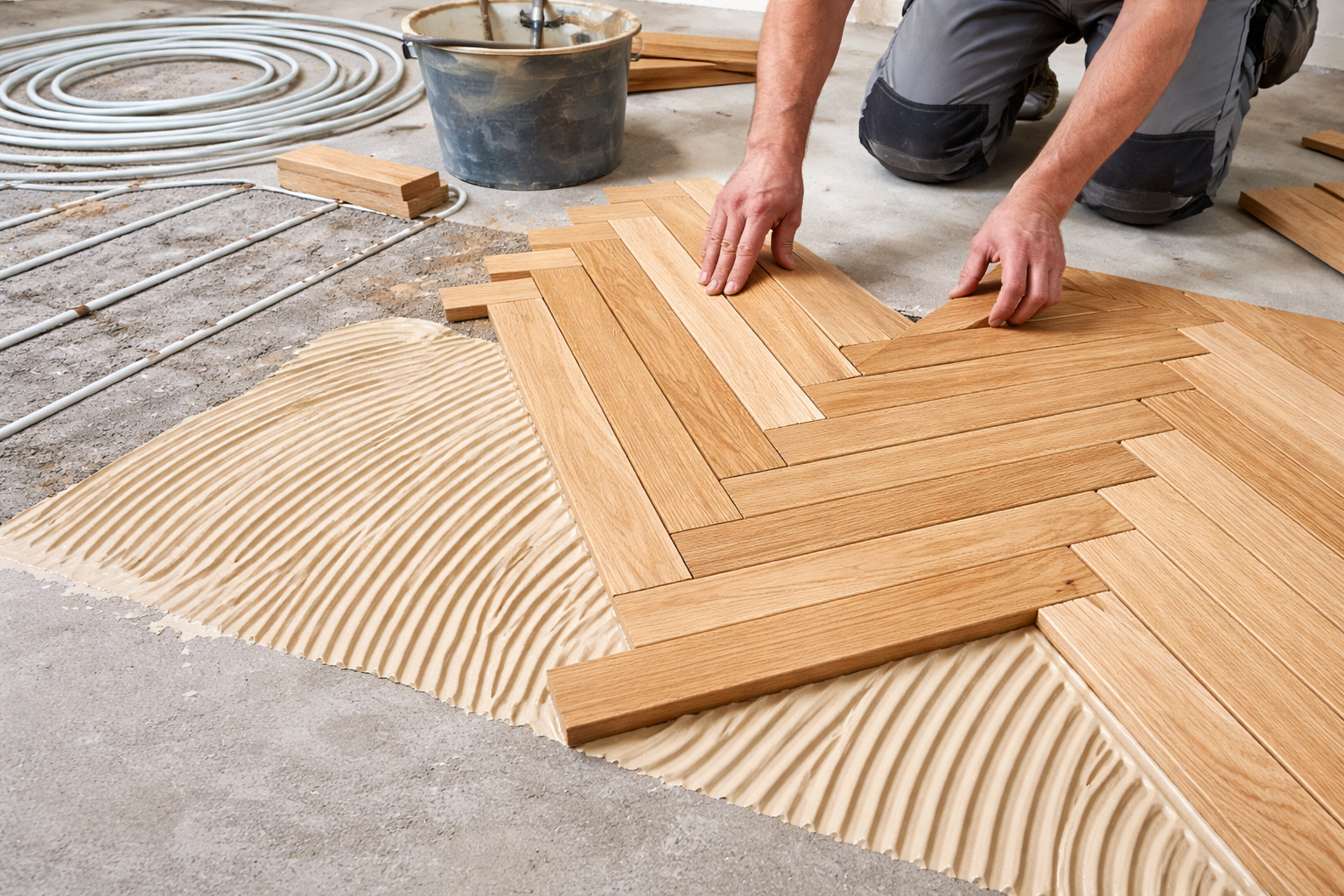 Температура поверхні перед монтажем повинна бути стабільною, без різких коливань. Саме тому конструкція типу паркет ялинка на теплу підлогу потребує особливої уваги до підготовчого етапу, адже стабільність основи безпосередньо впливає на довговічність покриття.