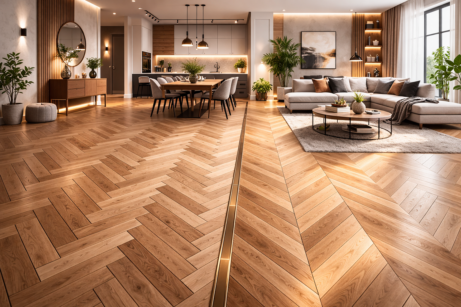 Поєднання різних ялинок дозволяє керувати масштабом приміщення. Чітке чергування форматів додає глибини, а правильне вирівнювання ліній забезпечує цілісність композиції без перевантаження простору.